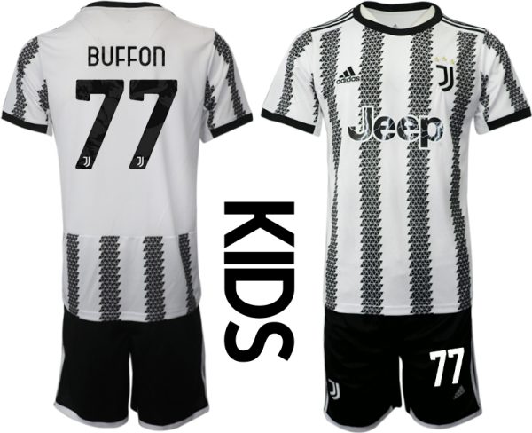 Kinder Juventus FC 2022-23 Heimtrikot Schwarz Weiß Kurzarm + Kurze Hosen BUFFON 77