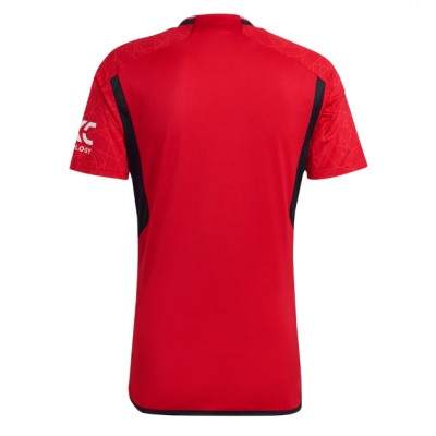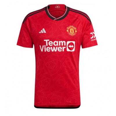 Dres Manchester United 2023-2024 kombinuje klasickou červenou hlavní barvu s černými logy a třemi pruhy a bílými detaily. Je to poprvé od sezóny 2019-2020, kdy je černá použita jako vedlejší barva. Oficiálně se červená barva nazývá "Team Collage Red".
