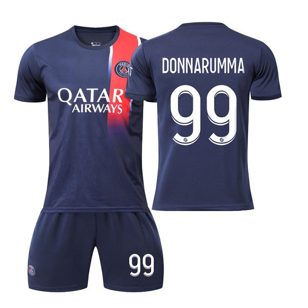 The Nike PSG 2023-24 Jersey is navy blue with a red stripe on the left side that fades towards the bottom of the jersey. There is also a white stripe to the left and right of the red jersey, inspired by the team's classic Hechter design, and the fading design is inspired by the Paris skyline fading into the night sky. Interestingly, the swoosh is red and not white. All other sponsor logos are white.