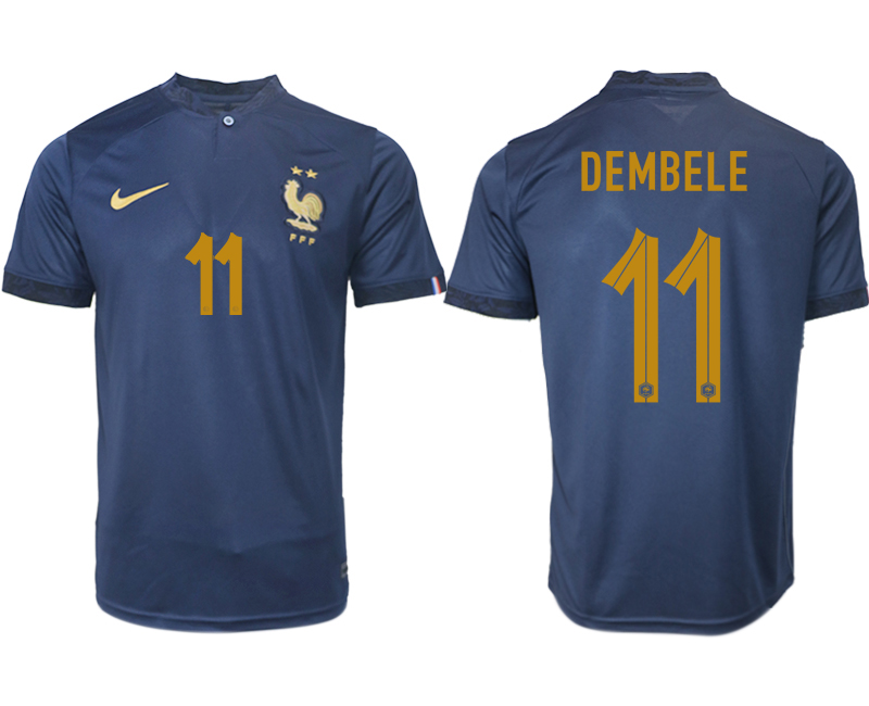La camiseta Nike de Francia 2022 para la Copa Mundial es la primera en 10 años que presenta aplicaciones doradas. Es principalmente azul marino con logotipos dorados y posiblemente algunos detalles dorados.