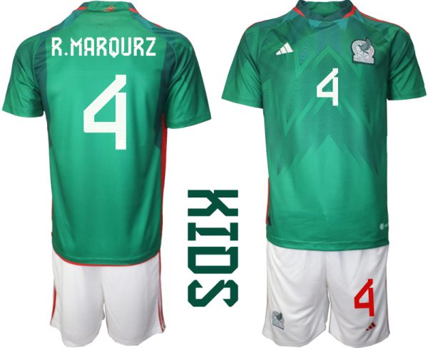 R.MARQURZ 4 Niño Camiseta México Mundial 2022 Verde Manga Corta + Short