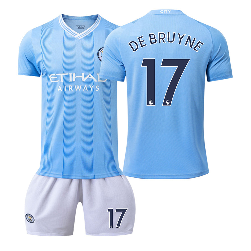 Kinder Manchester City 2023-24 Heimtrikot Blau Kurzarm + weiss Kurze Hosen DE BRUYNE 17