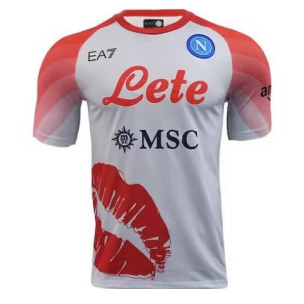 Das EA7 Napoli 2022-23 Valentine’s Trikot verwendet die gleiche Template wie die aktuellen Heim- und Auswärtstrikots. Bei dieser Ausgabe ist die Grundfarbe weiß, während die Ärmel einen Farbverlauf von Rot zu Rosa aufweisen.Ein großer roter Kussmund befindet sich auf der rechten unteren Seite des EA7 Napoli 2022-23 Valentine’s Trikots. EA7 kombiniert das Napoli 22-23 Valentine’s Trikot mit weißen Hosen und Stutzen.
