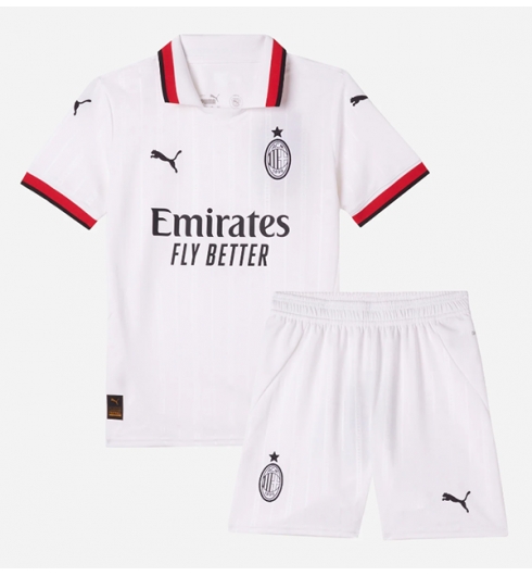 Das weiße Auswärtstrikot greift das klassische Farbdesign des AC Mailand auf und präsentiert einen neuen Look für die Saison 24/25. Das weiße Trikot weist ein dezentes Muster mit vertikalen Streifen auf. Der Kragen und die Manschetten sind mit roten und schwarzen Verzierungen versehen, und ein schwarzes Logo rundet das Design ab. Es gibt ein mit Silikon aufgedrucktes AC Mailand-Wappen und zwei heißübertragene Sponsorenlogos.