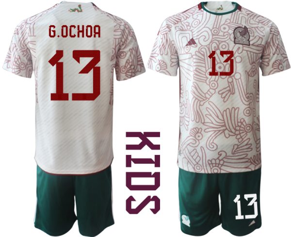 Kinder Mexiko 2022 WM Auswärtstrikot Kurzarm + Kurze Hosen mit Aufdruck G.OCHOA 13