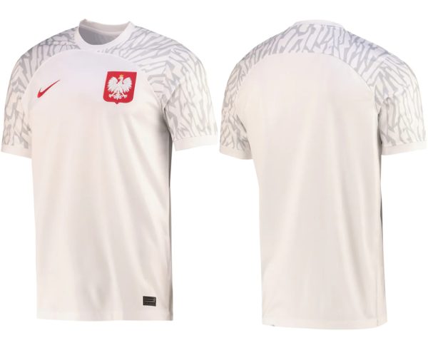 Das Nike Polen 2022 Heim trikot präsentiert ein klares Design in Weiß mit roten Logos und einer subtilen Grafik auf den Schultern und Ärmeln.Das Muster auf den Schultern und Ärmeln des Polen 2022 WM Heimtrikots ist vom Nest und den Federn des weißen Adlers, Polens Nationaltier, inspiriert.