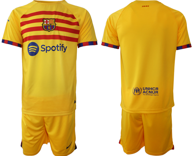 Het Nike Barcelona 22-23 vierde shirt combineert de kleuren van de Senyera, geel en rood, met blauw. Het Barcelona wapenschild en Spotify logo zijn in het midden geplaatst, terwijl er een swoosh op elke mouw staat.Het meest opvallende element van het Barcelona vierde shirt is de Senyera vlag (vierde rode streep op een gele achtergrond) op de bovenste voorkant. Het is dezelfde die te zien is op de aanvoerdersband.De Blaugrana manchetten voegen nog een extra touch toe aan het Nike Barça 22-23 4e shirt.Het Barcelona 22-23 vierde shirt heeft een vergelijkbaar patroon met het WK shirt van de VS 2022.