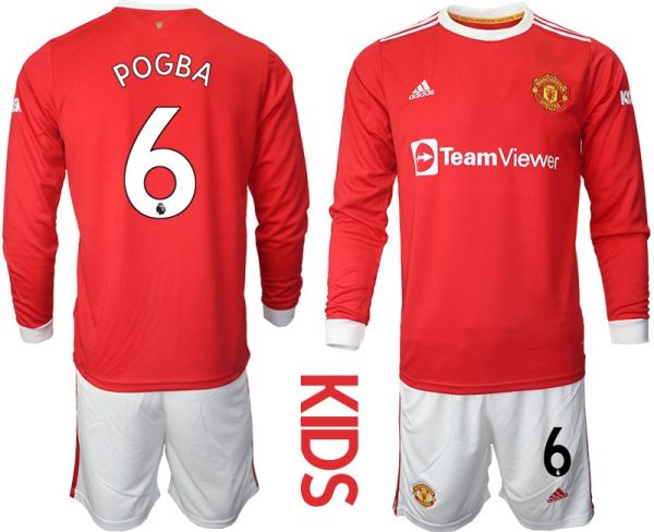 Detské futbalové tričká Manchester United domáce tričko 2022 s dlhým rukávom a potlačou Pogba 6