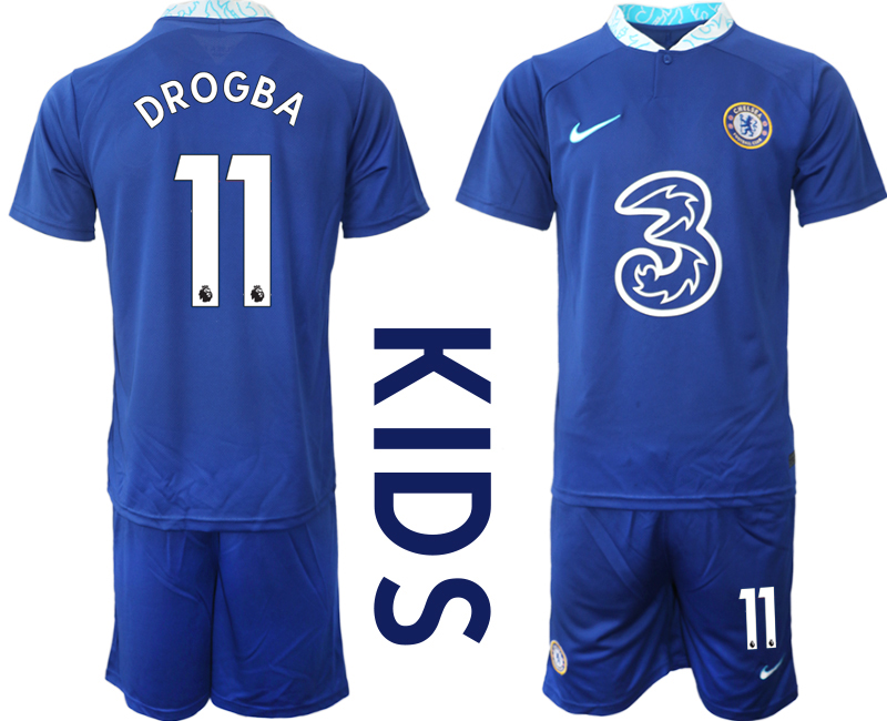 Otroška nogometna majica Chelsea FC 2022/23 Domača majica modra s kratkimi rokavi + kratke hlače s potiskom DROGBA 11