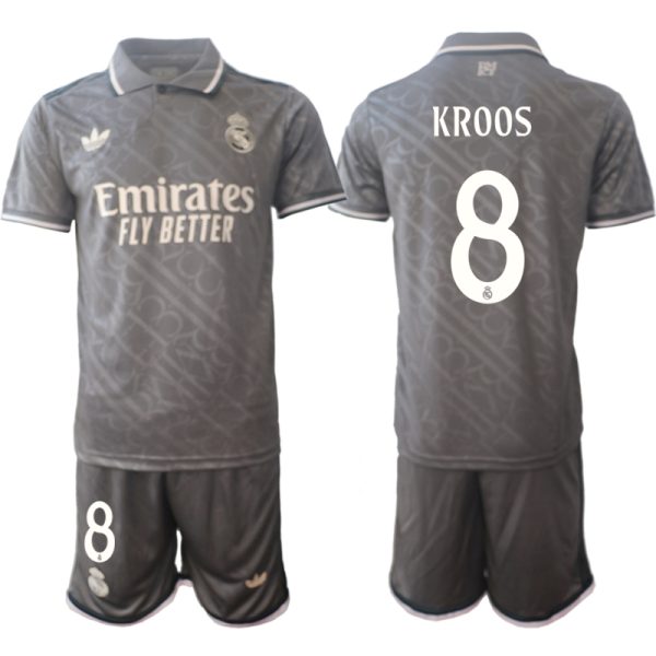 Real Madrid 2024-25 tredjetröja har en antracit huvudfärg (Charcoal), som kombineras med "RMCF" prägling över hela tröjan för ett unikt utseende.Madrid 24-25 tredjetröja har en polokrage och muddar med ljusrosa (Putty Mauve)/mörkgrå kant.