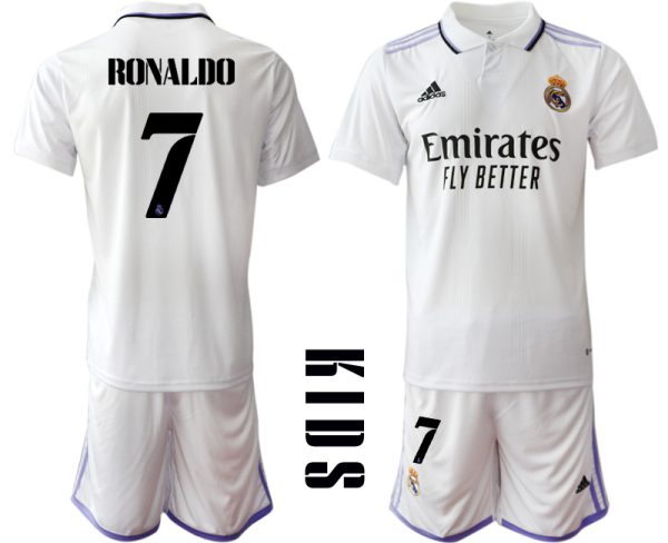 RONALDO #7 Kids Hemmatröja Real Madrid Hemmatröja vit lila 2022/23 Billiga Fotbollströjor